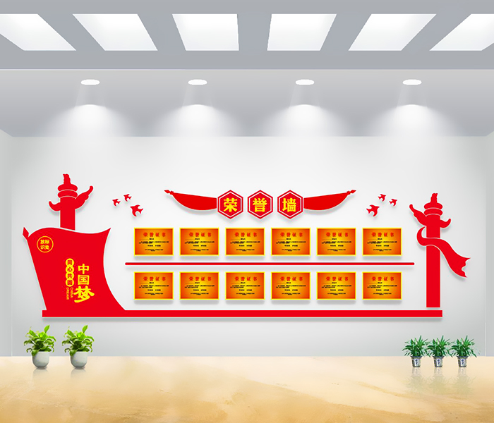 裝飾效果:設(shè)計(jì)榮譽(yù)墻時,可以運(yùn)用不同的裝飾效果來提升視覺效果和吸引力。例如,使用燈光照明、背景墻裝飾、鏤空設(shè)計(jì)等來增加墻面的層次感和立體感。