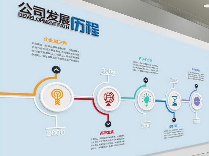 發展歷程墻又叫企業大事紀,主要記錄公司發展過程中遇到的各種重大事件,以及事件對公司發展造成的影響,它是見證公司成長的重要窗口,為員工或客戶快速了解公司提供了一個良好的平臺。