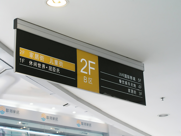 商場室內指引牌:在商場內設置壁掛式指引牌,用于指引顧客到達不同的樓層和品牌店鋪。指引牌標注清晰的樓層號碼和店鋪名稱,并配有地圖和箭頭指示,幫助顧客快速找到目的地。商場的壁掛式指引牌制作方案可以采用亞克力板材制作,選擇醒目的顏色和字體,使顧客更容易識別。
